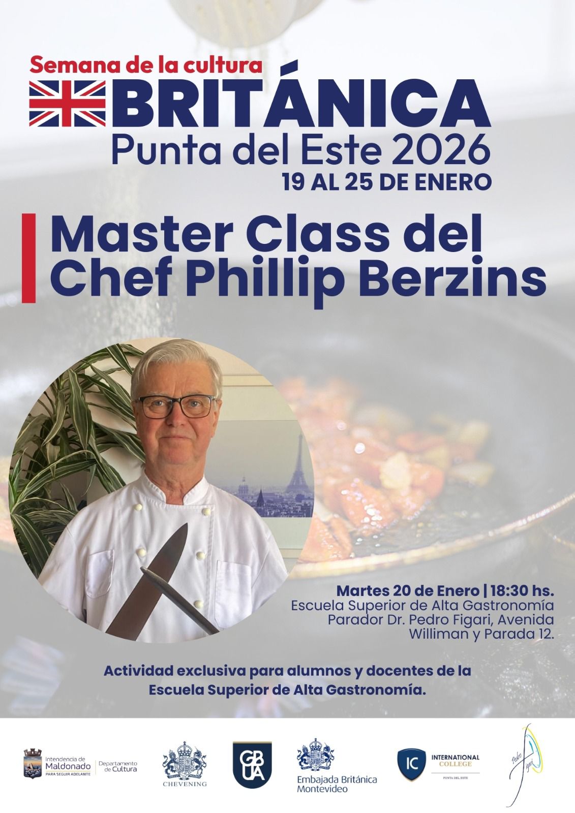 El 20 de enero, la escuela ofrecerá una masterclass a cargo del chef Phillip Berzins, a las 18:30 horas. Esta actividad se enmarca en la celebración de los históricos lazos que unen a ambas naciones, respaldados por la Embajada Británica en Montevideo y el programa de becas internacionales Chevening. La iniciativa es organizada por la Intendencia de Maldonado y la Asociación de Graduados de Universidades Británicas (GBUA), institución que desde 1999 congrega a graduados de universidades británicas en Uruguay y promueve el desarrollo de las relaciones culturales, con el objetivo de fomentar un mayor conocimiento entre ambos países a través de vínculos académicos y profesionales.