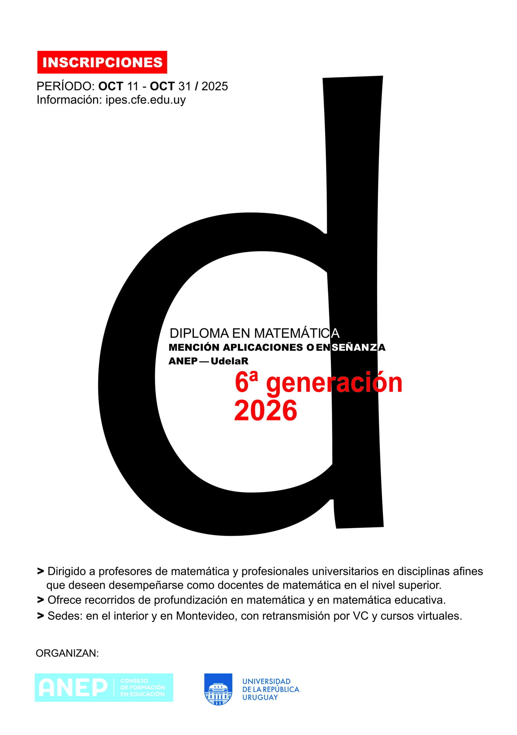 El Diploma en Matemática con mención en Aplicaciones o Enseñanza 5.ª Cohorte, se dictará en distintas sedes tanto del interior como de Montevideo y será retransmitido por videoconferencia con 40 cupos disponibles. Las inscripciones se recibirán del 11 al 31 de octubre del presente año hasta las 23:59 horas.