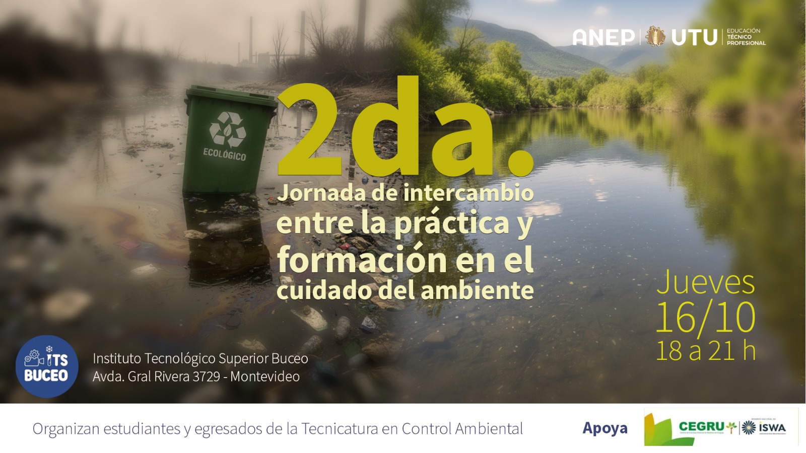 Este jueves 16 de octubre, a las 18 horas en el Instituto Tecnológico Superior Buceo, se llevará a cabo la segunda jornada de intercambio entre la práctica y la formación en el cuidado del ambiente, organizado por los estudiantes y egresados de la Tecnicatura en Control Ambiental.