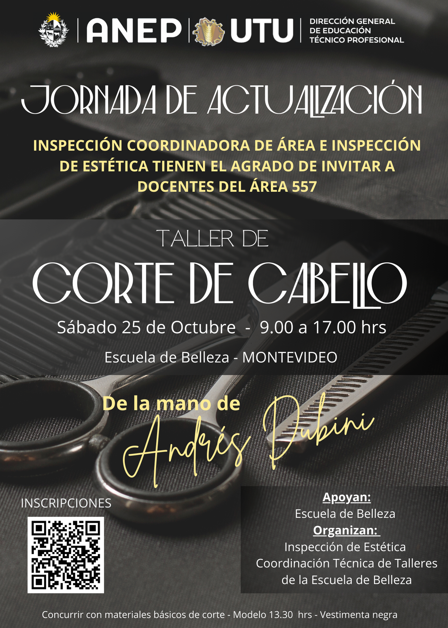 La Inspección Técnica invita a los docentes del área 557 a una jornada de actualización dictada por el docente Andrés Dubini, se dictará el sábado 25 de octubre en la Escuela de Belleza (San Salvador 1674) de 9 a 17 horas.